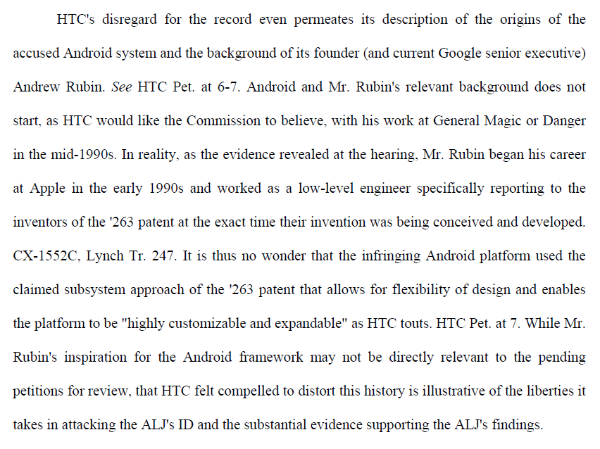 Android and Mr. Rubin's relevant background does not start, as HTC would like the Commission to believe, with his work at General Magic or Danger in the mid-1990s. In reality, as the evidence revealed at the hearing, Mr. Rubin began his career at Apple in the early 1990s and worked as a low-level engineer specifically reporting to the inventors of the '263 [realtime API] patent at the exact time their invention was being conceived and developed. [...] It is thus no wonder that the infringing Android platform used the claimed subsystem approach of the '263 patent that allows for flexibility of design and enables the platform to be "highly customizable and expandable" as HTC touts. [...] While Mr. Rubin's inspiration for the Android framework may not be directly relevant to the pending petitions for review, that HTC felt compelled to distort this history is illustrative of the liberties it takes in attacking the ALJ's [initial determination] and the substantial evidence supporting the ALJ's findings.