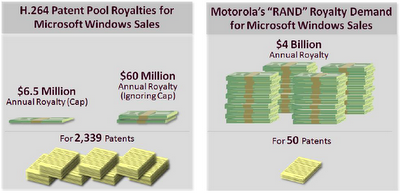 This relates to the H.264 video codec standard. On the left side of that chart, Microsoft highlights that it pays to the MPEG LA pool (which contains 2,339 patents on H.264, contributed by 29 different companies) an annual royalty that is capped at $6.5 million. If the cap didn't exist, the amount would be $60 million. By sharp contrast, Motorola holds only 50 such patents but has made a royalty demand that would, even in the most conservative (!) estimate, amount to $4 billion. It's conservative because, as Microsoft's motion explains, Motorola wants 2.25% of the price of the relevant end product (i.e., an entire computer running Windows), and the underlying assumption here is a very low average per-PC price of $500.