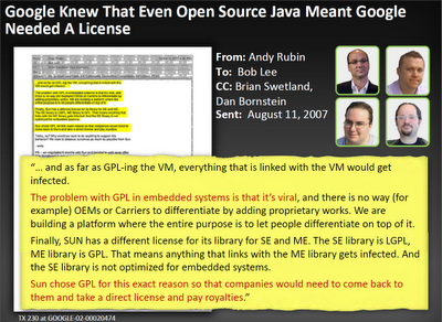 Sun never wanted to give away its intellectual property in Java to everyone and turn Java into a zero-revenue (or service-revenues-only) business. Sun always knew that there would be commercial players who wouldn't want to be bound by the terms of the GPL -- such as Google. Not only Sun. Google also knew it. Here's one of Oracle's opening slides, which shows an excerpt from an email Andy Rubin sent to other key Android players at Google on August 11, 2007 (click on the image to enlarge):